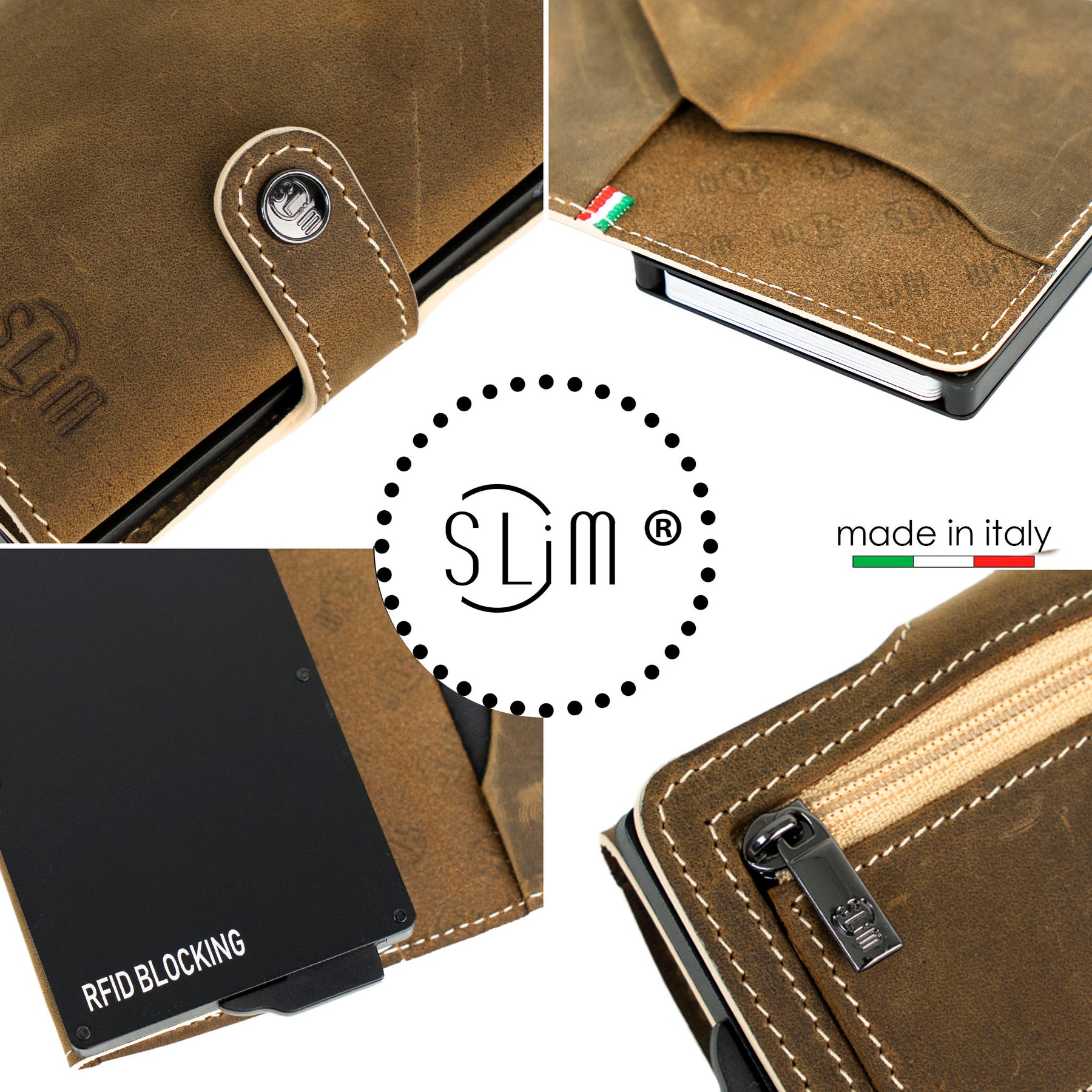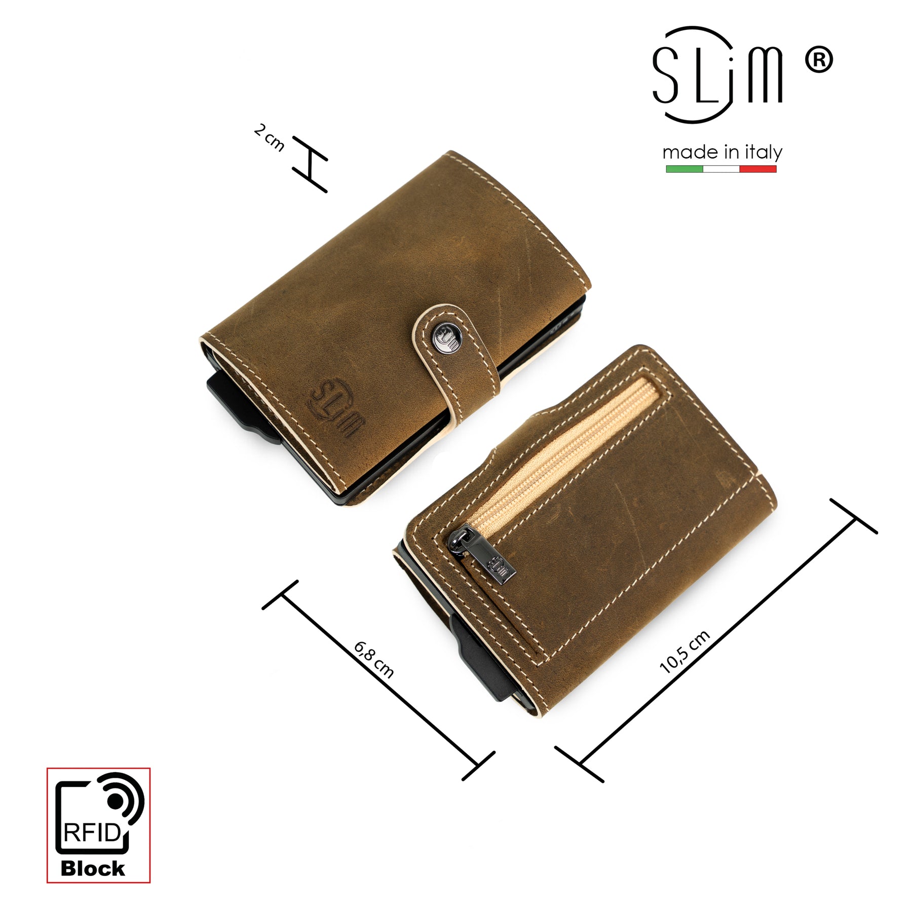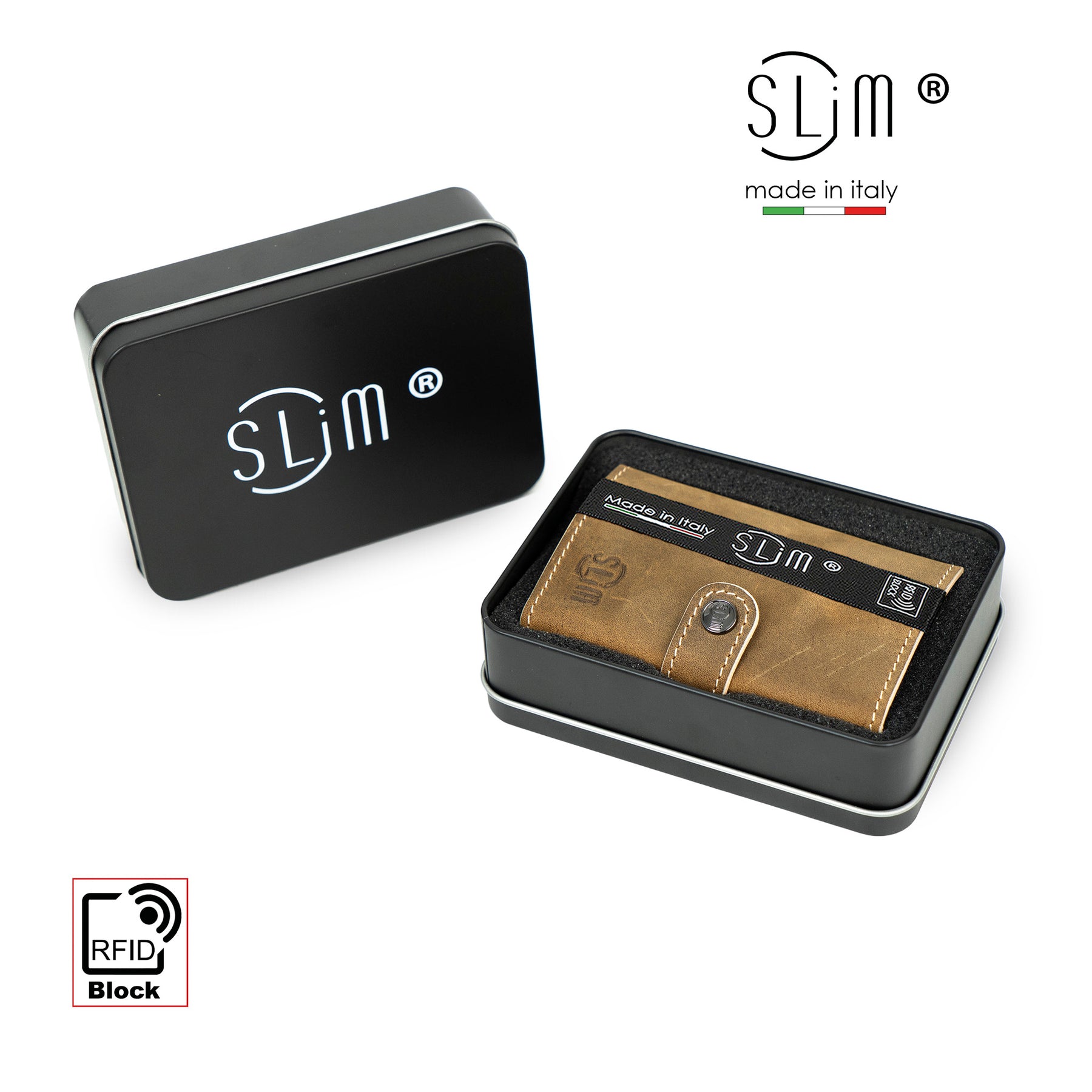 Compatto, leggero e sicuro, sono questi i tre aggettivi che descrivono il portafoglio SLim®. Infatti misura solamente 10,5 x 7 x 1,7 cm con un peso di soli 75 gr! Puoi inserire fino a 12 carte, 6/7 carte nella cassa in alluminio con protezione RFID e 4/5 nei taschini interni del portafogli.
