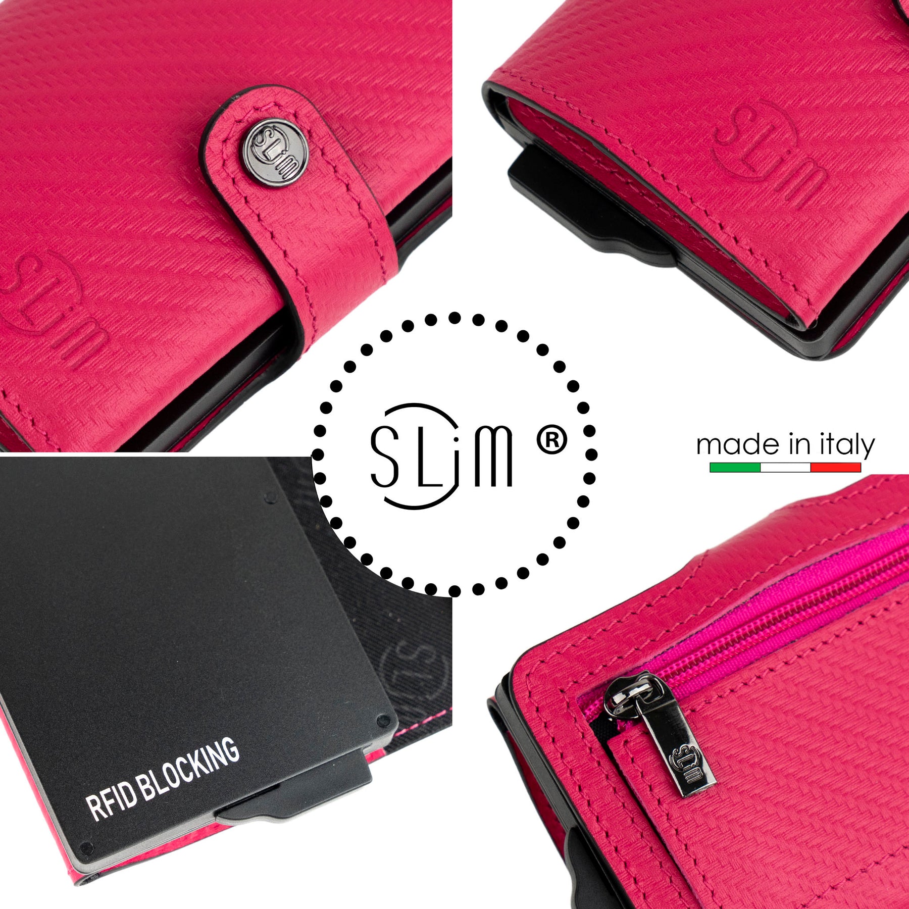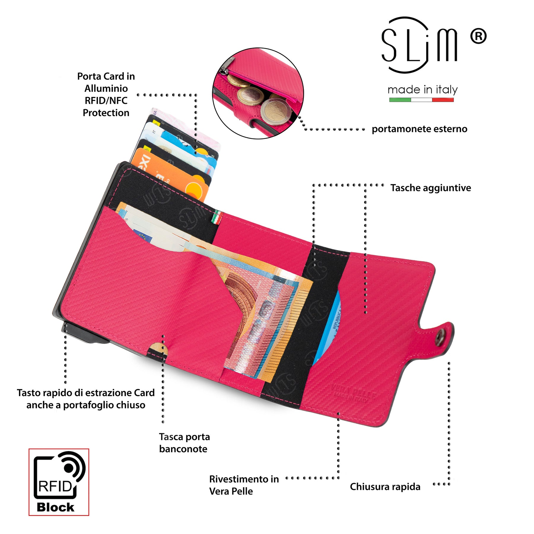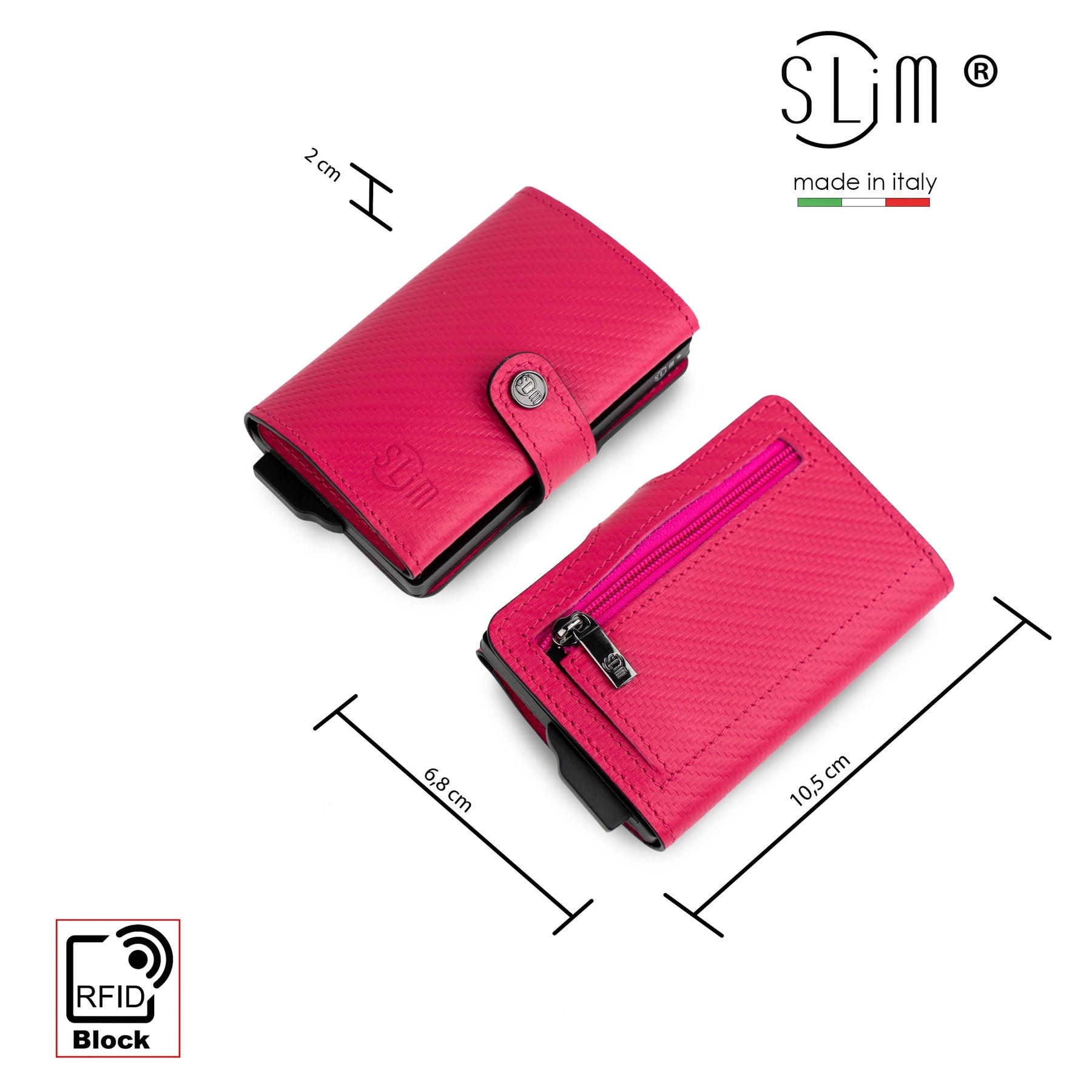 Compact, lightweight, and secure —these are the three adjectives that best describe the SLim® wallet. It measures just 10.5 x 7 x 2 cm and weighs just 75 g! You can enter up to 12 cards, 6/7 cards in the aluminum case with RFID protection and 4/5 in the internal pockets of the wallet.