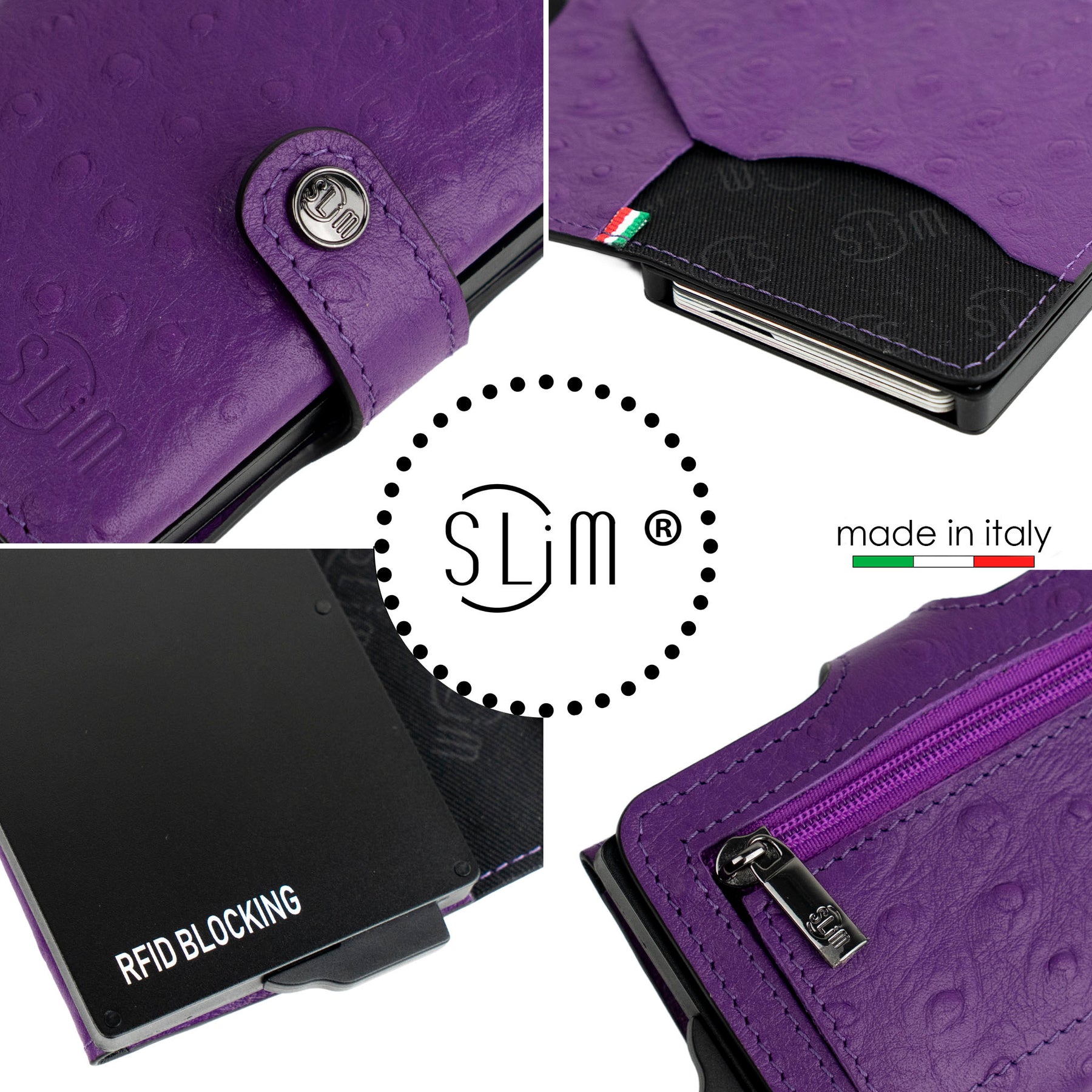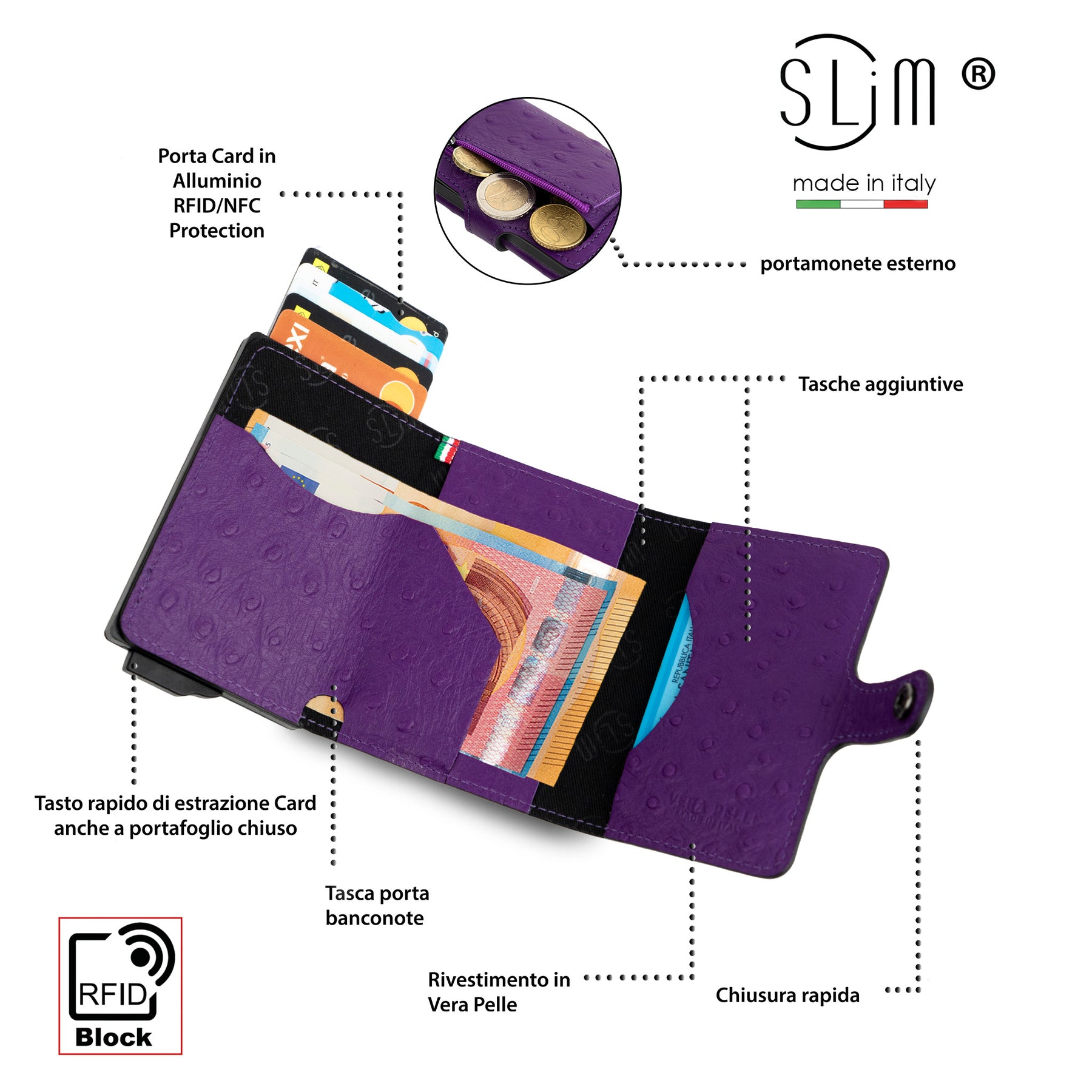 Compact, lightweight, and secure —these are the three adjectives that best describe the SLim® wallet. It measures just 10.5 x 7 x 2 cm and weighs just 75 g! You can enter up to 12 cards, 6/7 cards in the aluminum case with RFID protection and 4/5 in the internal pockets of the wallet.