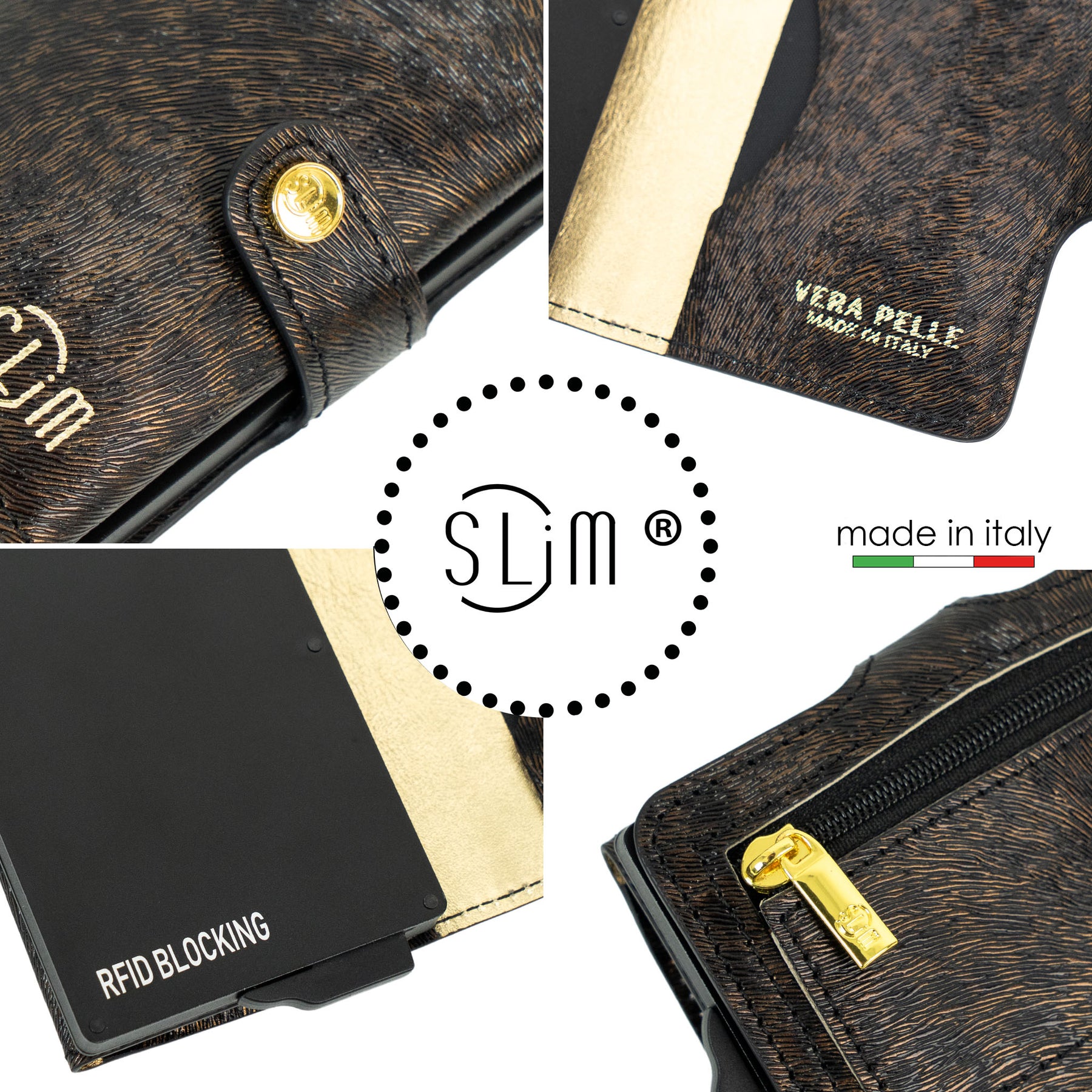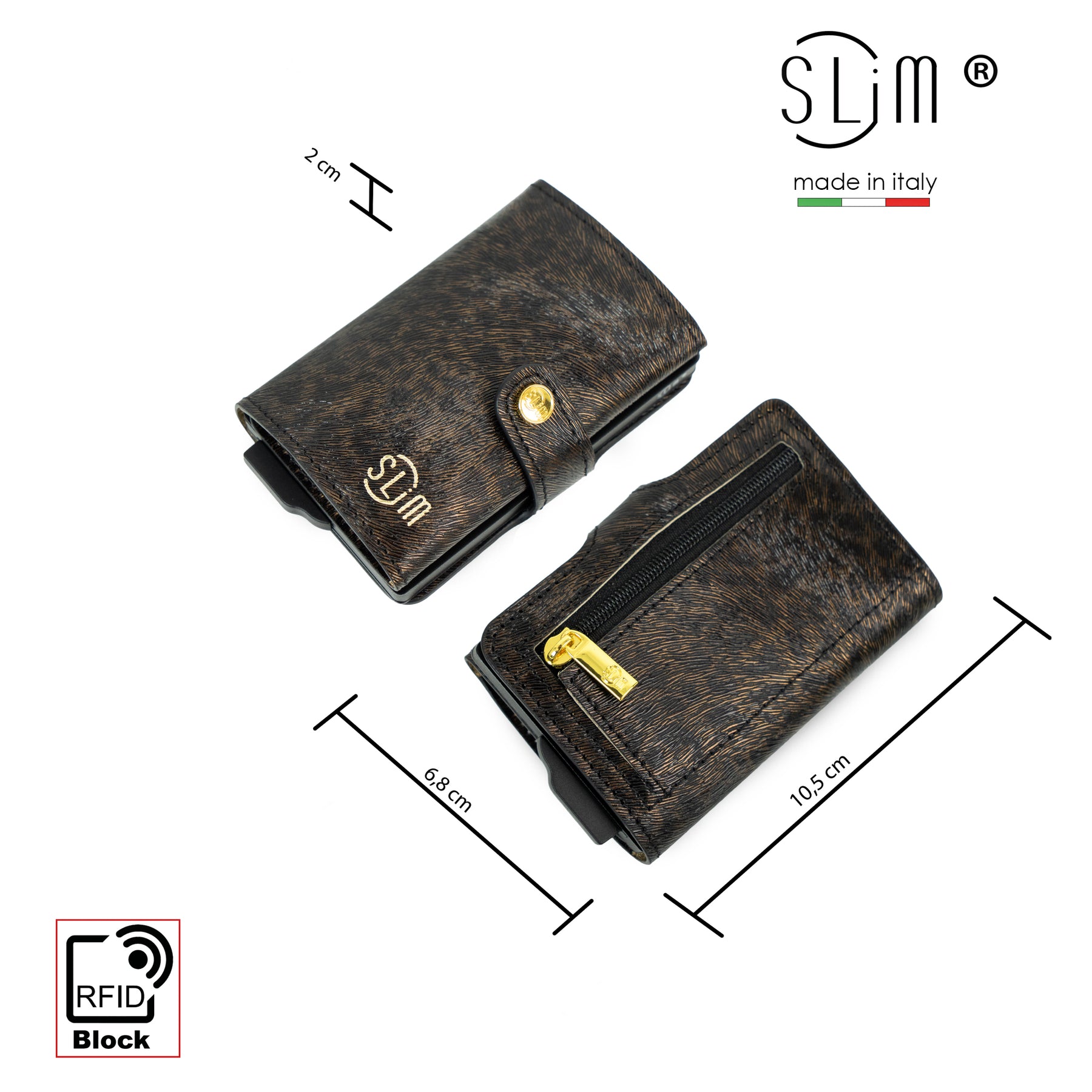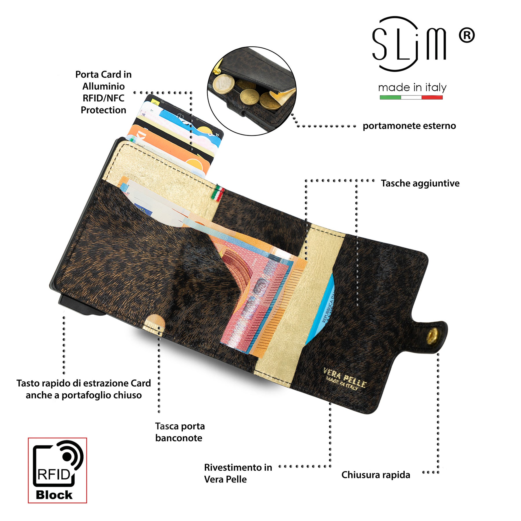Compact, lightweight, and secure —these are the three adjectives that best describe the SLim® wallet. It measures just 10.5 x 7 x 1.7 cm and weighs just 75 g! You can hold up to 12 cards. 6/7 cards in the aluminum case with RFID protection and 4/5 in the internal pockets of the wallet.