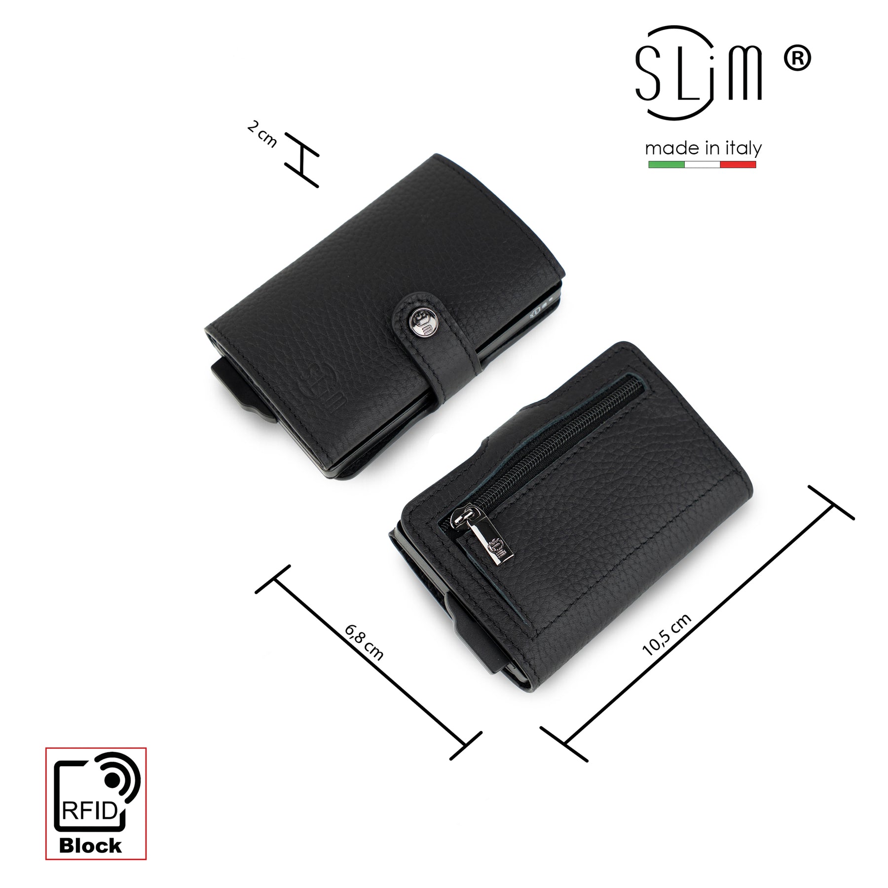 Compact, lightweight, and secure —these are the three adjectives that best describe the SLim® wallet. It measures just 10.5 x 7 x 2 cm and weighs just 75 g! You can enter up to 12 cards, 6/7 cards in the aluminum case with RFID protection and 4/5 in the internal pockets of the wallet.
